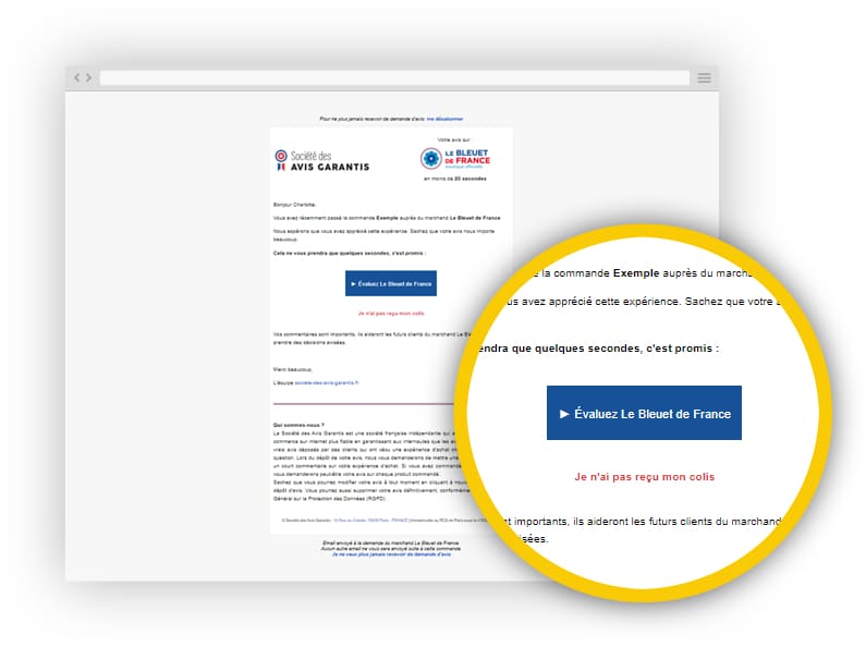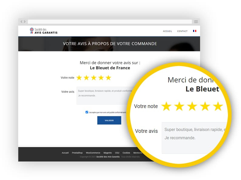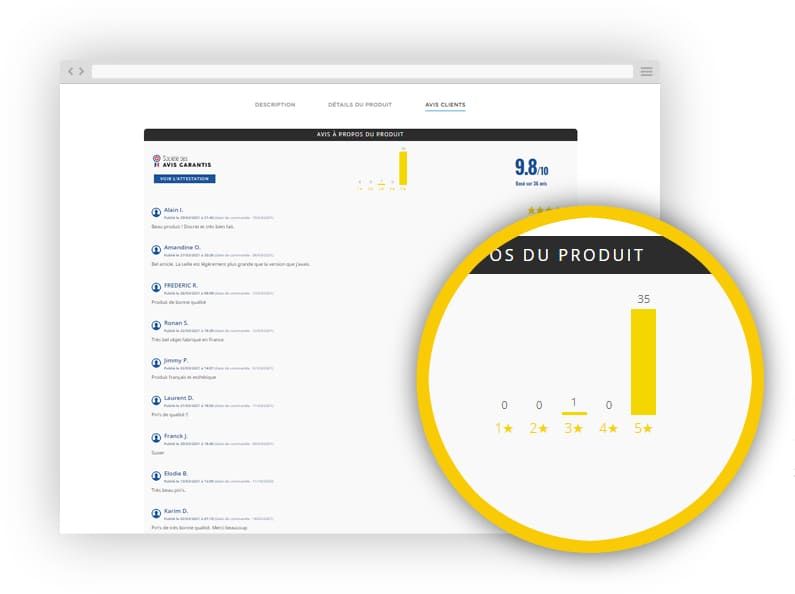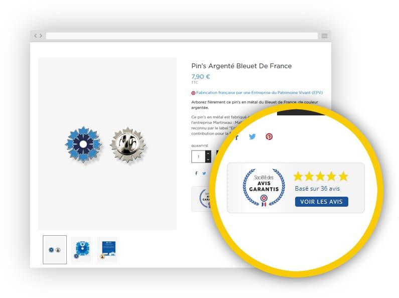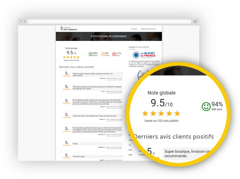 A « Menção de excelência » é concedida a todos os comerciantes que obtiveram uma pontuação global superior a 8/10. Um verdadeiro selo de qualidade que você poderá destacar, tanto na vitrine da sua loja quanto no seu site. A Sociedade de Avaliações Garantidas ajuda você a aumentar a sua visibilidade e a melhorar a sua e-reputação.